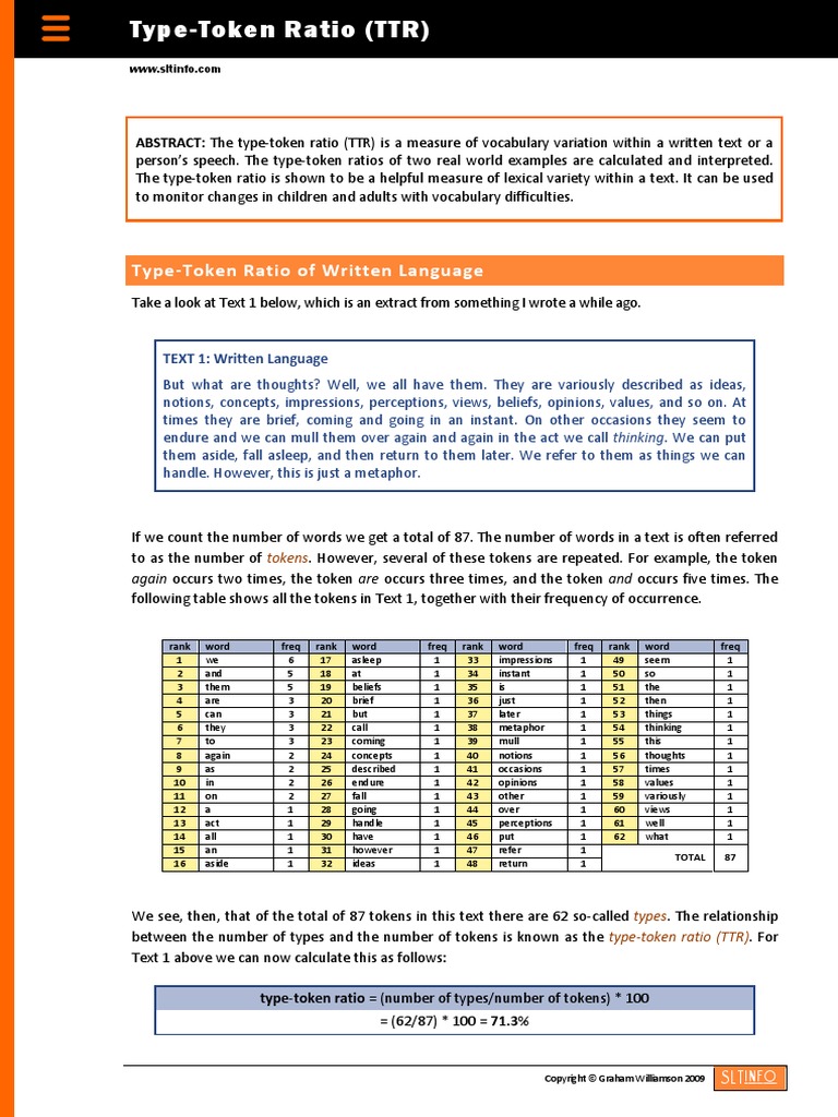 Web A type-token ratio TTR is the total number of UNIQUE words types divided by the total number of words tokens in a given segment of language. Web How to Calculate Type-Token Ratio. It is also important to note that some studies Mizon 1981.